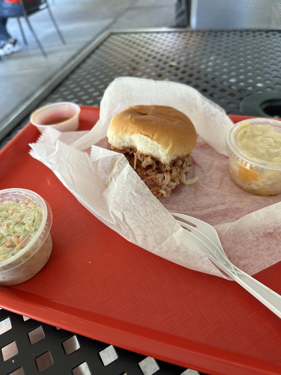 Pork BBQ Sandwich Mac and Cheese Cole Slaw